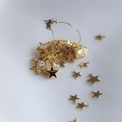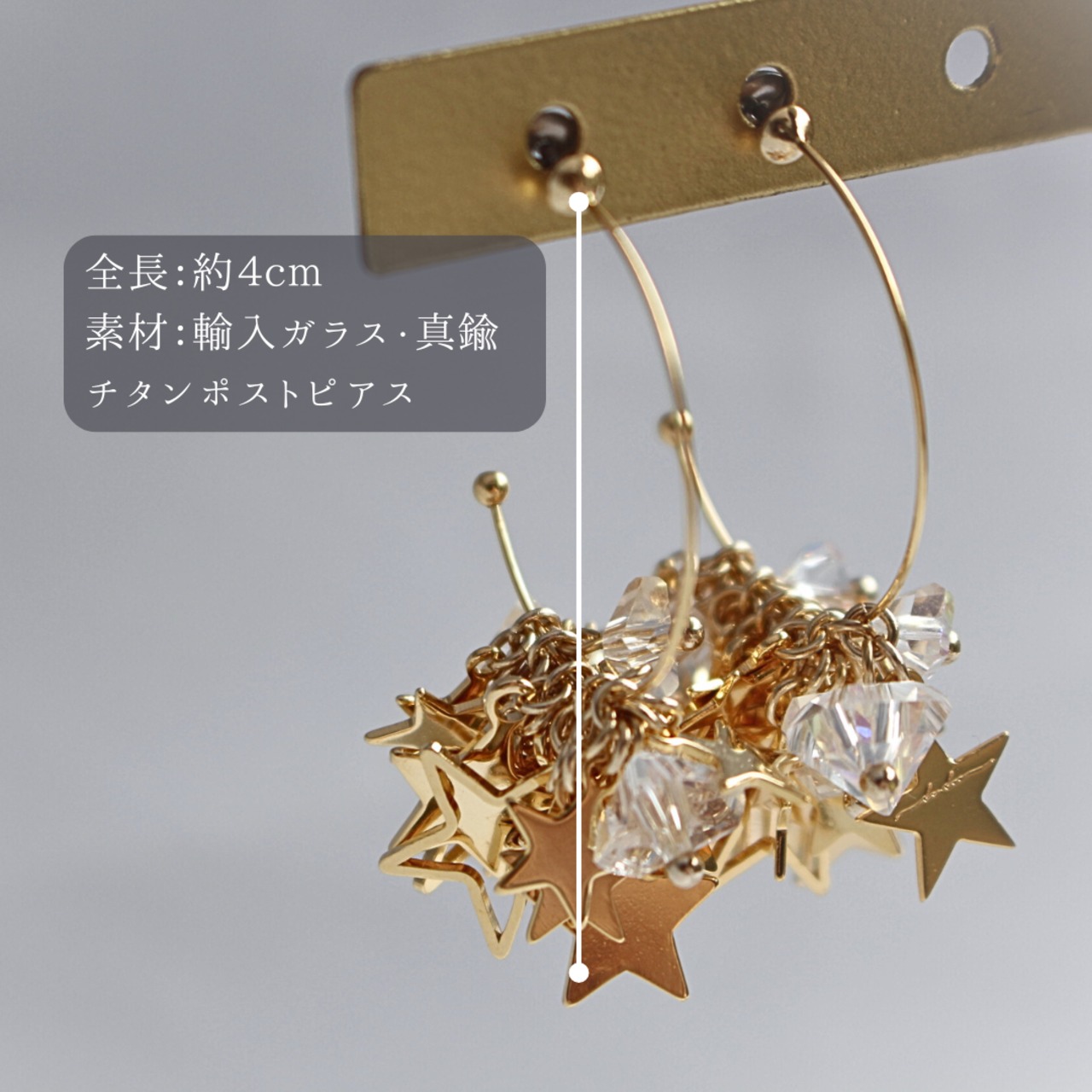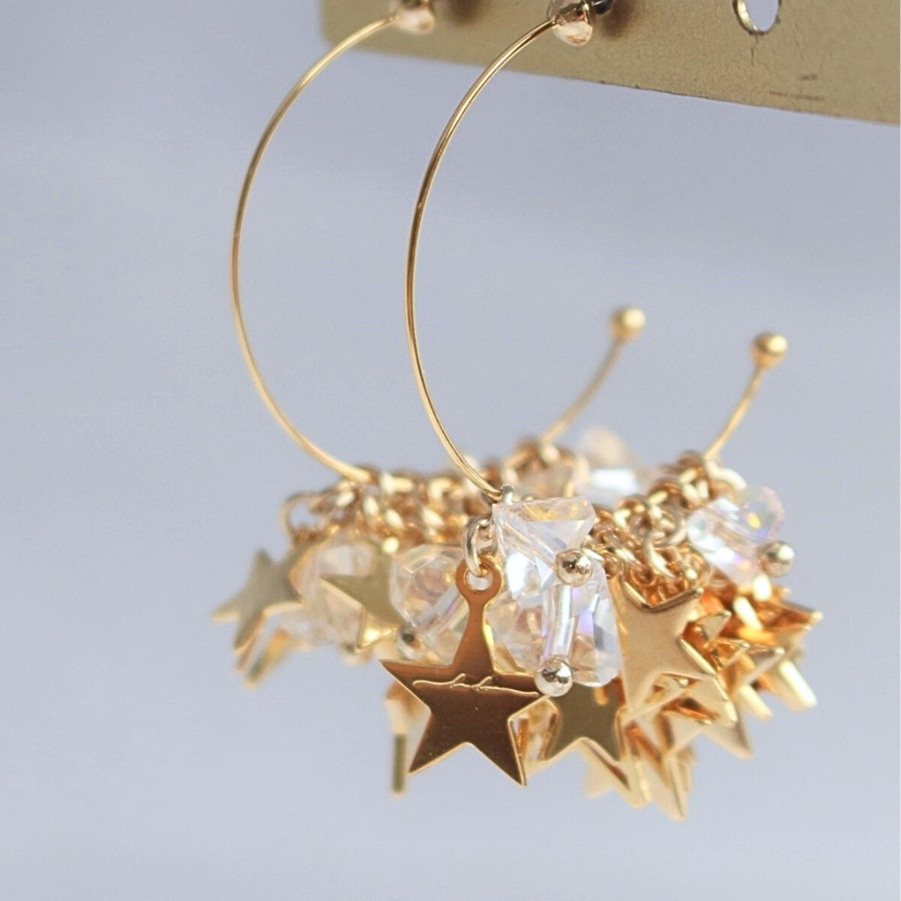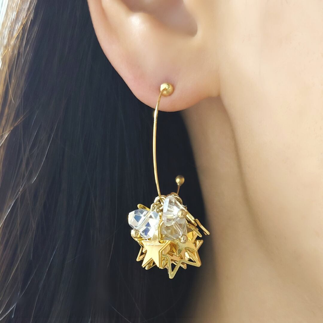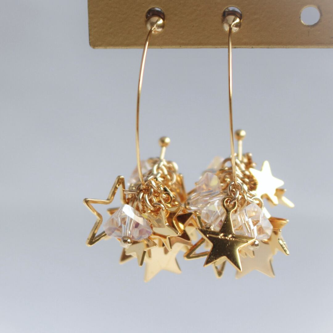 大小さまざまな星たちとカットが美しいガラスの粒で仕立てたフープピアス