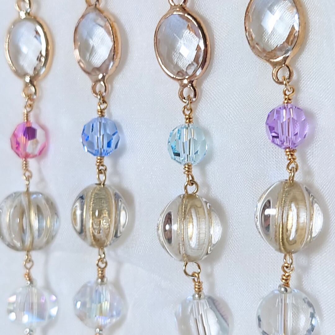 ヴィンテージガラス、チェコガラス、ドイツガラスと色々な場所のものを利用しているため一言でガラスといっても様々です。が、ガラスなので落とした際当たり所が悪ければ欠けたり割れたりも考えられます。お取り扱いに注意いただきながらそれぞれの個性をお楽しみいただければと思います。