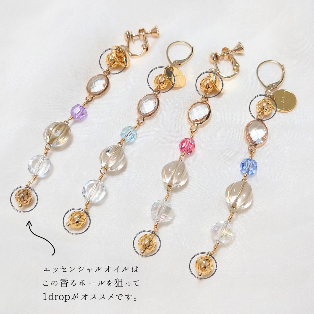 ・デザインにより変動がありますがお花シリーズは中心付近、透明度の高い部分に、揺れるタイプのデザインは金色の球場の金具にオイルを垂らし、その後数分置いてからお使いください。