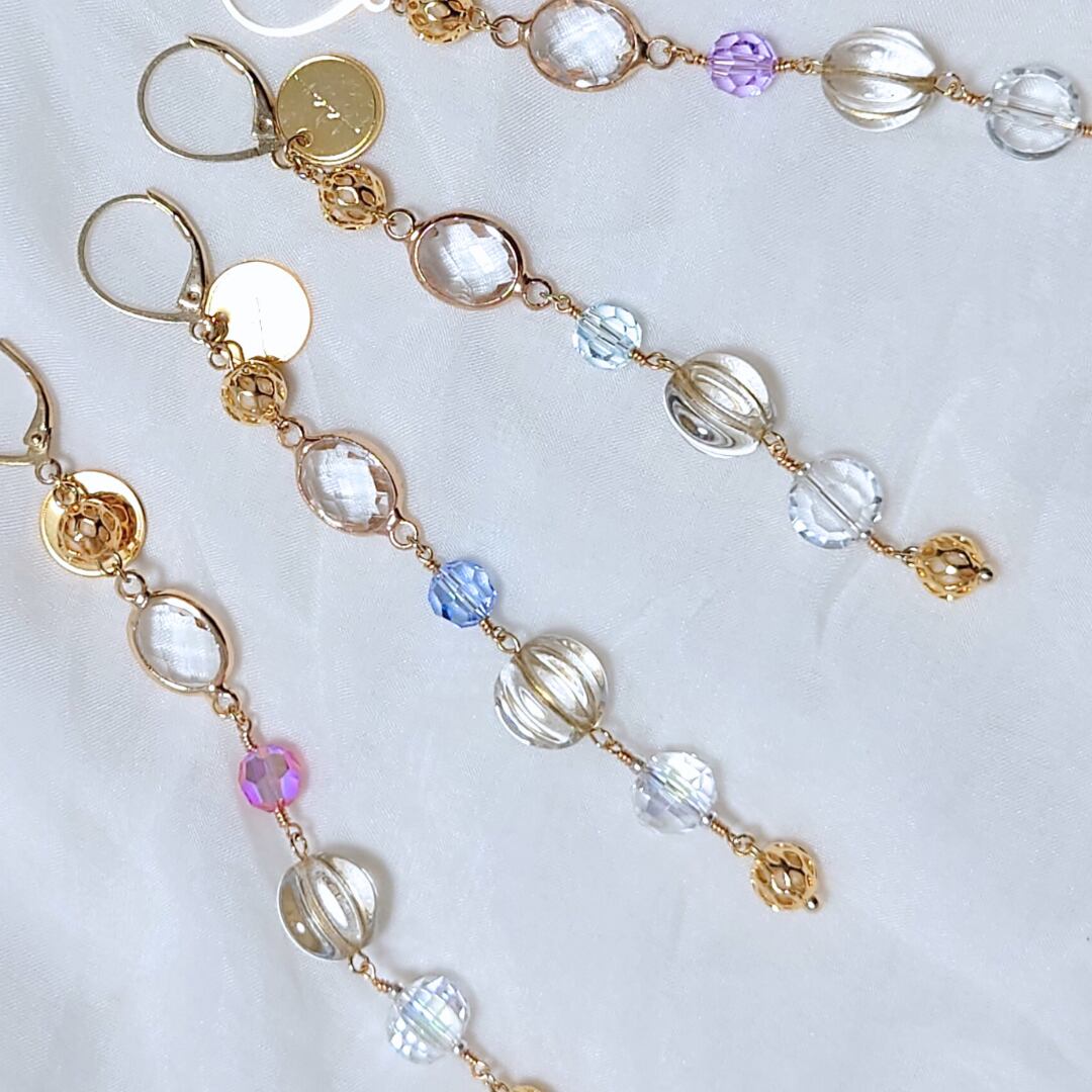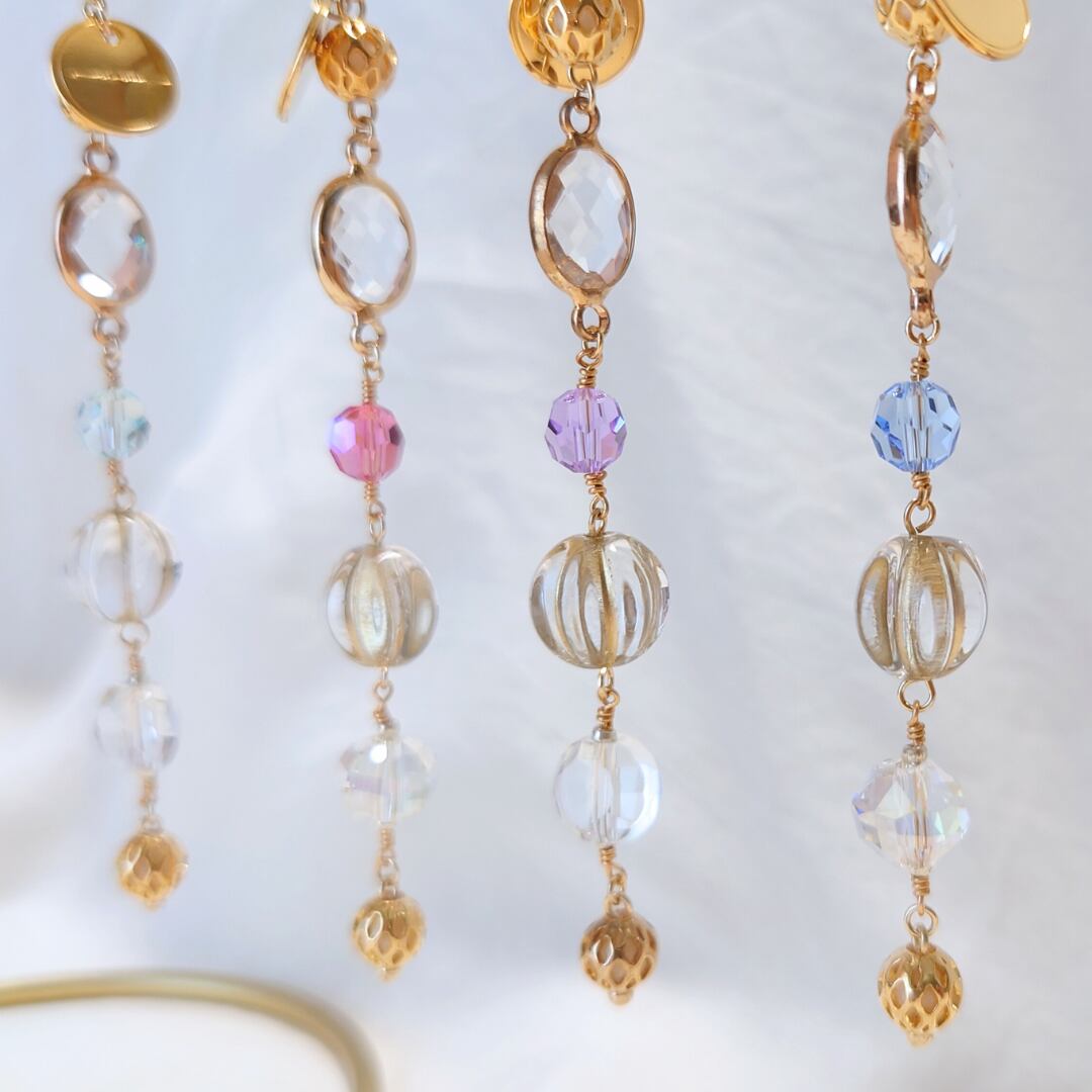 存在感のあるガラスを片耳用のアクセサリーとしてロングタイプに繋げました。